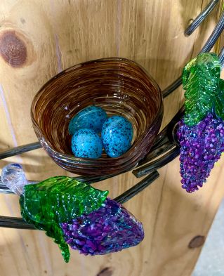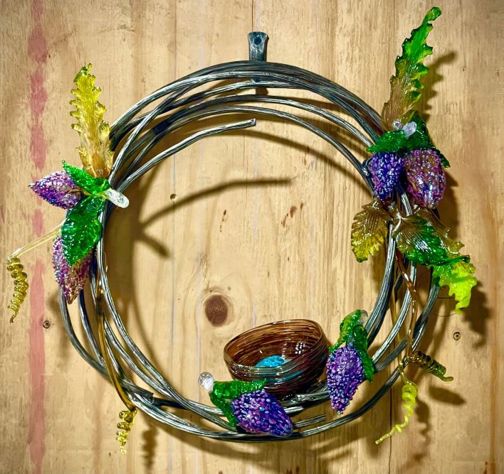 Chris Nordin often combines metal, wood and glass in his custom sculptures. The wreath structure is made of metal. All other components of this particular sculpture are hand-blown glass. The lilacs contain a small portion of Shelby’s cremation remains.