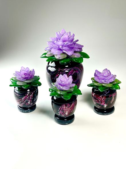 Succulent plants are so easy to grow, so forgiving when we forget to water and tend to them. These special glass urns will remind you of carefree, sunny and playful days, full of warmth and vibrancy. Their exuberant, many-petaled charm might capture something of the colorful, multi-faceted life or personality of your loved one.